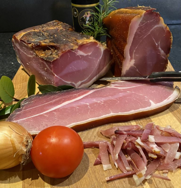Die Schweine für meinen nach eigenem Rezept hergestellten Schinkenspeck stammen von ausgesuchten Bauernhöfen aus der Region und werden in einem kleinen Betrieb selbst geschlachtet .